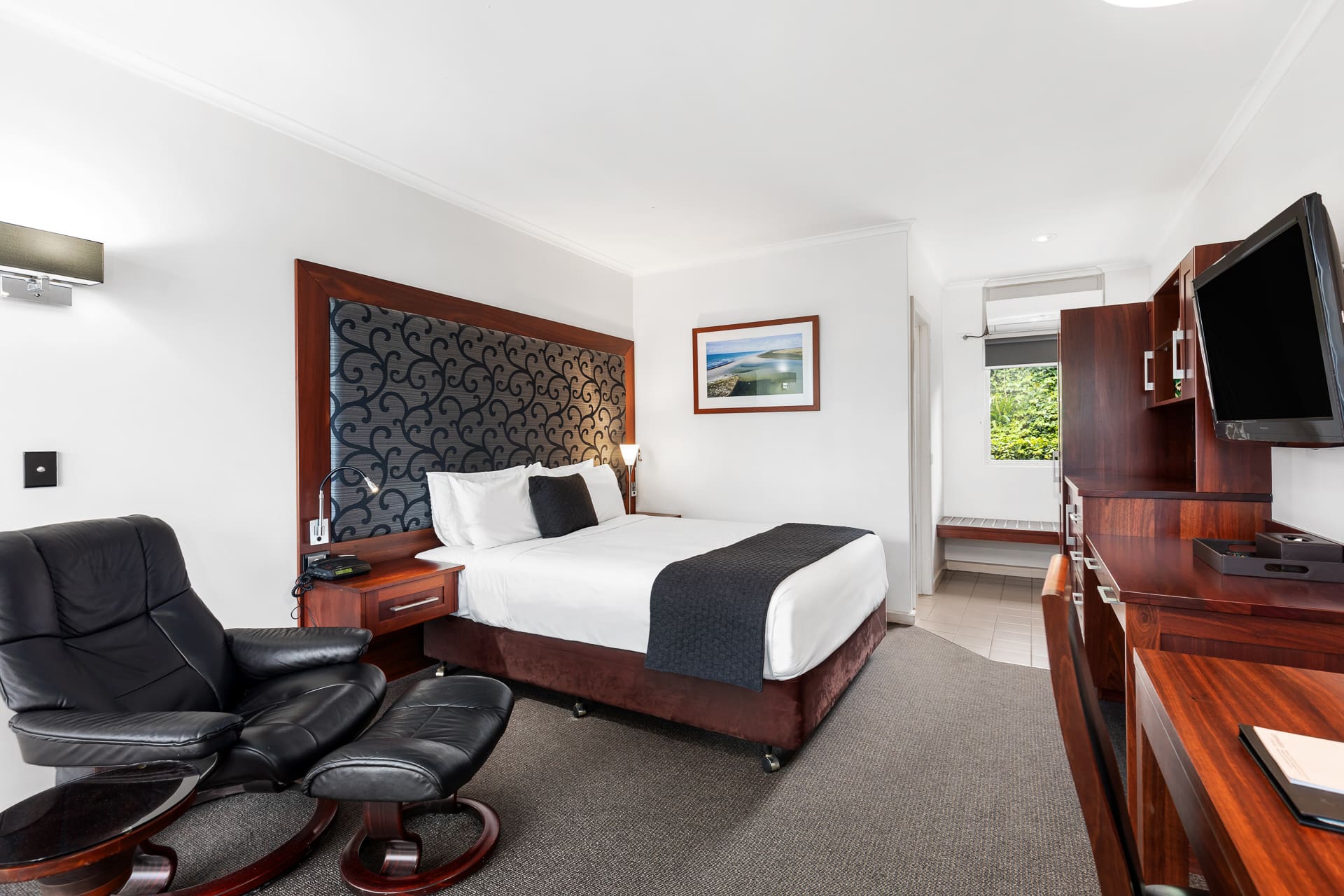 Situated at the back of the complex our Superior suites offer a relaxed space for a great stay. All rooms are comfortably furnished with one queen bed, table and chairs, desk and a leather recliner. The room also contains an ensuite bathroom with walk-in shower and offers Complimentary WI-FI access.